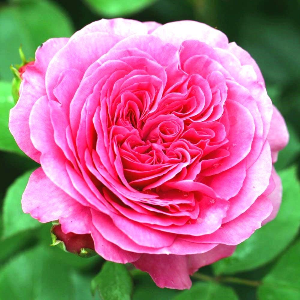 Флорибунда из серии ностальгических роз, с густомахровыми розетковидными цветками яркого фуксиевого цвета.