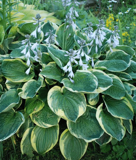 Кристмас Три - высота куста 50см, ширина 90см, листья сердцевидные, морщинистые, зеленые с узкой бело-кремовой окантовкой, цветки белые.