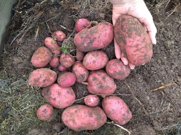 Кожура ярко-розовая, мякоть рассыпчатая, белоснежная, очень вкусная.