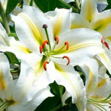 Высота растения 100-110 см. Цветки белого цвета с ярко-желтой полосой по середине каждого лепестка, которая становится зеленой ближе к центру.