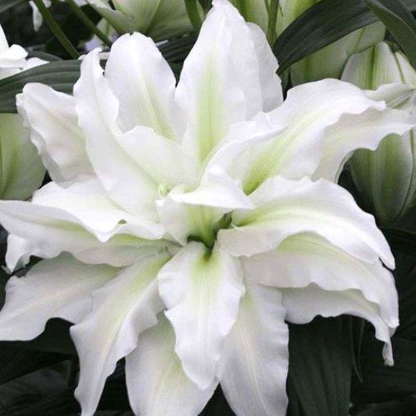 Светло-салатовая сердцевина только подчеркивает белизну основного цвета. Широкие копьевидные темно-зеленые листья с прожилками равномерно растут по всей длине цветоноса. Период цветения июль-август.