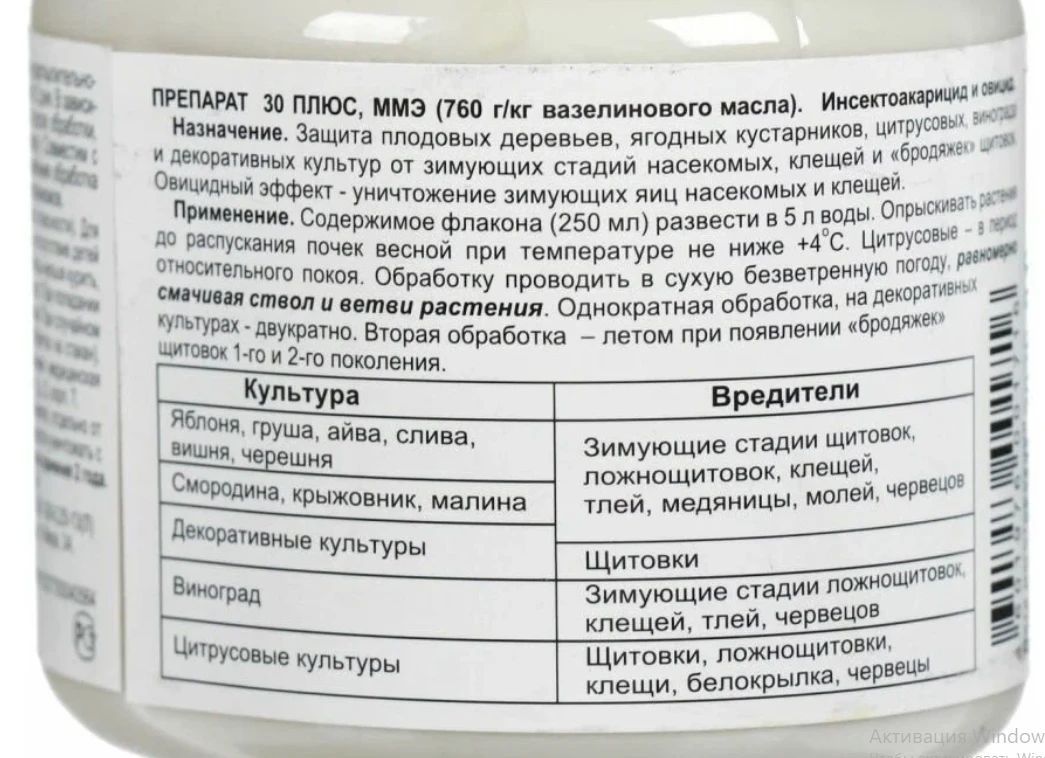 Препарат 30 плюс предназначен для весенней обработки сада от зимующих насекомых и летней обработки декоративные культур в период появления бродяжек щитовок.