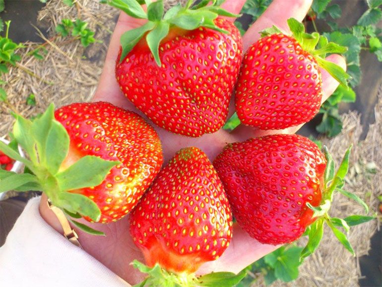 Первые ягоды довольно крупные, до 60 гр, (в среднем 25-35 гр.) имеют правильную симметричную широко-коническую форму, без шейки.